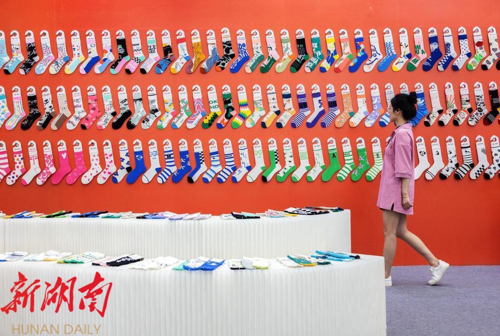 8月23日,一名女子在袜业博览会上参观。新华社发(郭斌摄)