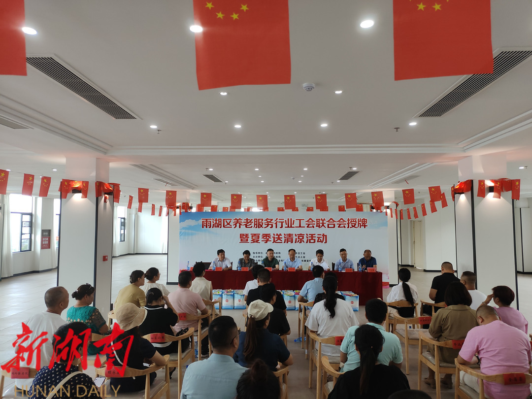 授牌仪式上,区总工会开展了“工会送清凉 防暑保安康”活动,与会领导为雨湖区养老服务行业一线护理员发放170余份物资;养老机构代表纷纷感谢市、区两级领导对养老服务从业人员的关心关怀;区养老服务行业工会联合会负责人表示,今后将强化基层工会建设,健全完善工会班子和制度建设,积极发挥工会“娘家人”的作用,积极开展职工练兵提升行业技能水平,优化养老服务促推养老行业发展; 市首届职业技能大赛(养老护理) 获奖护理员贺欢喜结合工作实际分享养老护理的宝贵经验,展现行业互促共进的良好风貌。