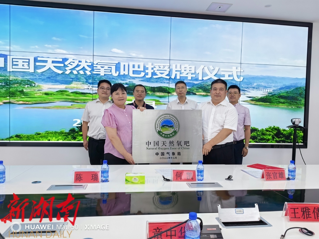 新湖南客户端8月25日讯(记者 郑湘 通讯员 杨金涛)近日,中国气象局发布的2022年气候生态品牌创建示范活动评审结果显示,湘西土家族苗族自治州古丈县荣获“中国天然氧吧”称号。8月23日下午,湘西州气象局为古丈县发放奖牌和证书。古丈县委副书记、县长陈瑞,副县长粟继红参加授牌仪式。