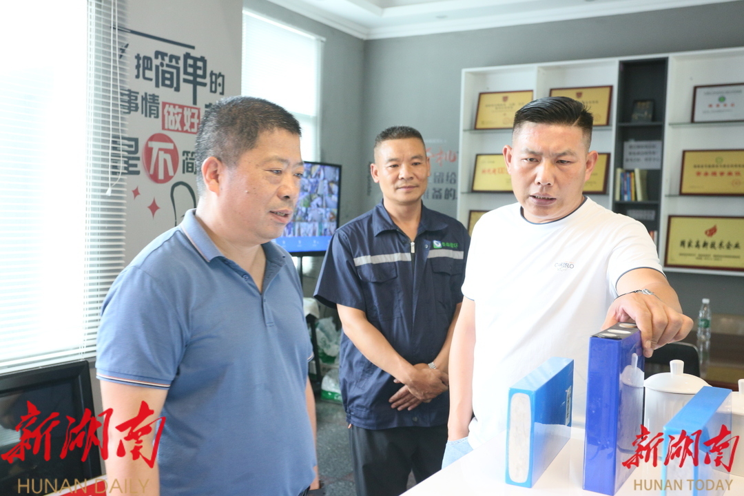 安化泰森循环科技有限责任公司董事长易中华(右一)向安化经开区负责人介绍公司产品。周云峰 摄
