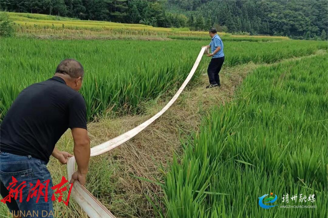 靖州融媒8月29日讯 (通讯员 宁荣荣 潘阳艳 )近日,靖州苗族侗族自治县渠阳镇横江桥便民服务中心干部在辖区干旱稻田铺设水管,引水入田,解决农田缺水问题。