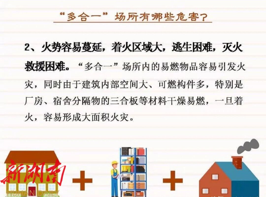 衡东融媒8月29日讯(融媒体记者 肖海艳)“多合一”场所,是指住宿与生产、仓储、经营场所混合设置在同一空间内的建筑。其住宿与其他使用功能之间未设置有效的防火分隔,火灾隐患比较大。