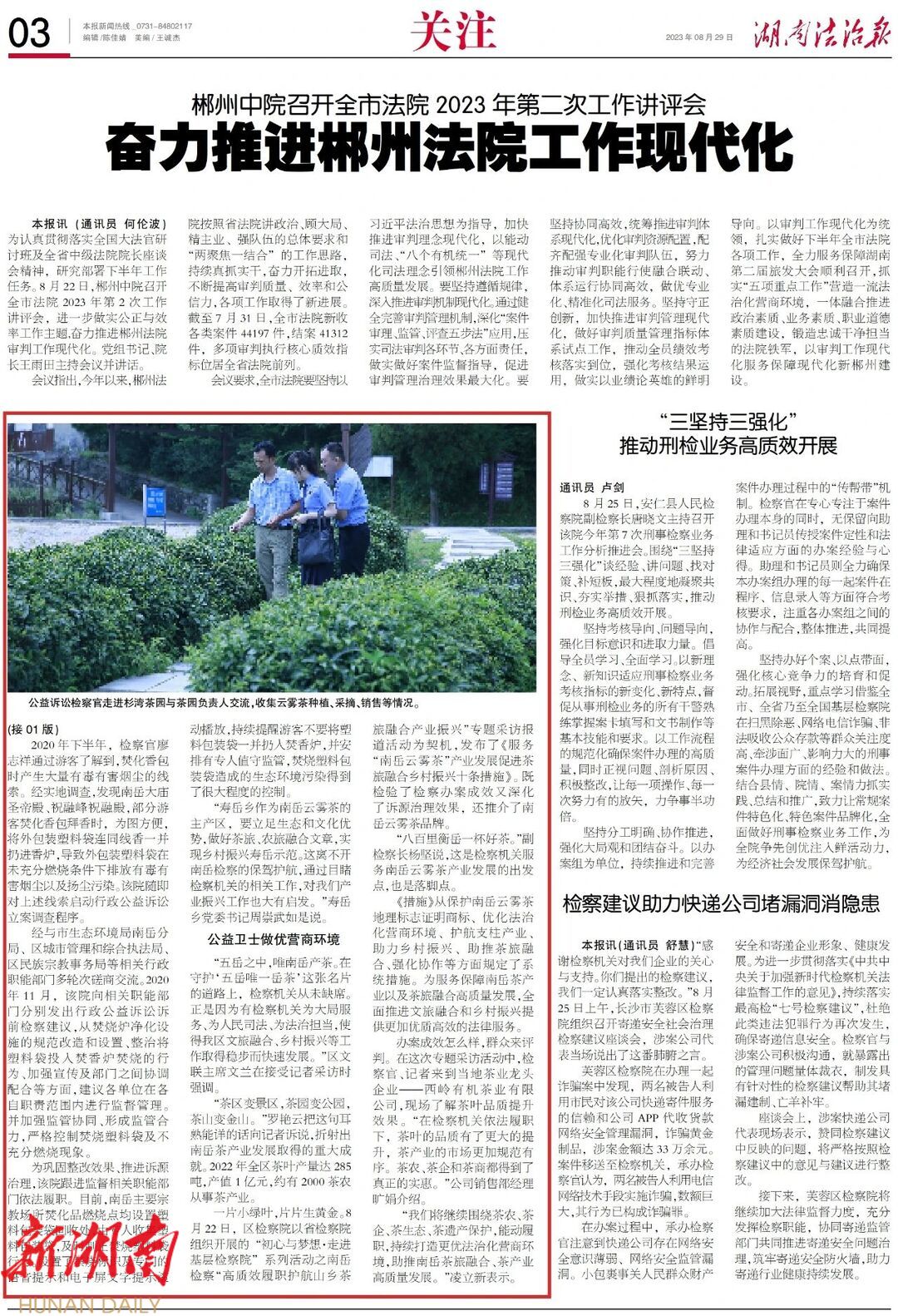 近年来,衡阳市南岳区检察院聚焦茶乡文旅保护,依托公益诉讼检察职能,积极守护好云雾茶的发展之路,助力“小绿叶”成就共同富裕大产业、铺就乡村振兴幸福路。