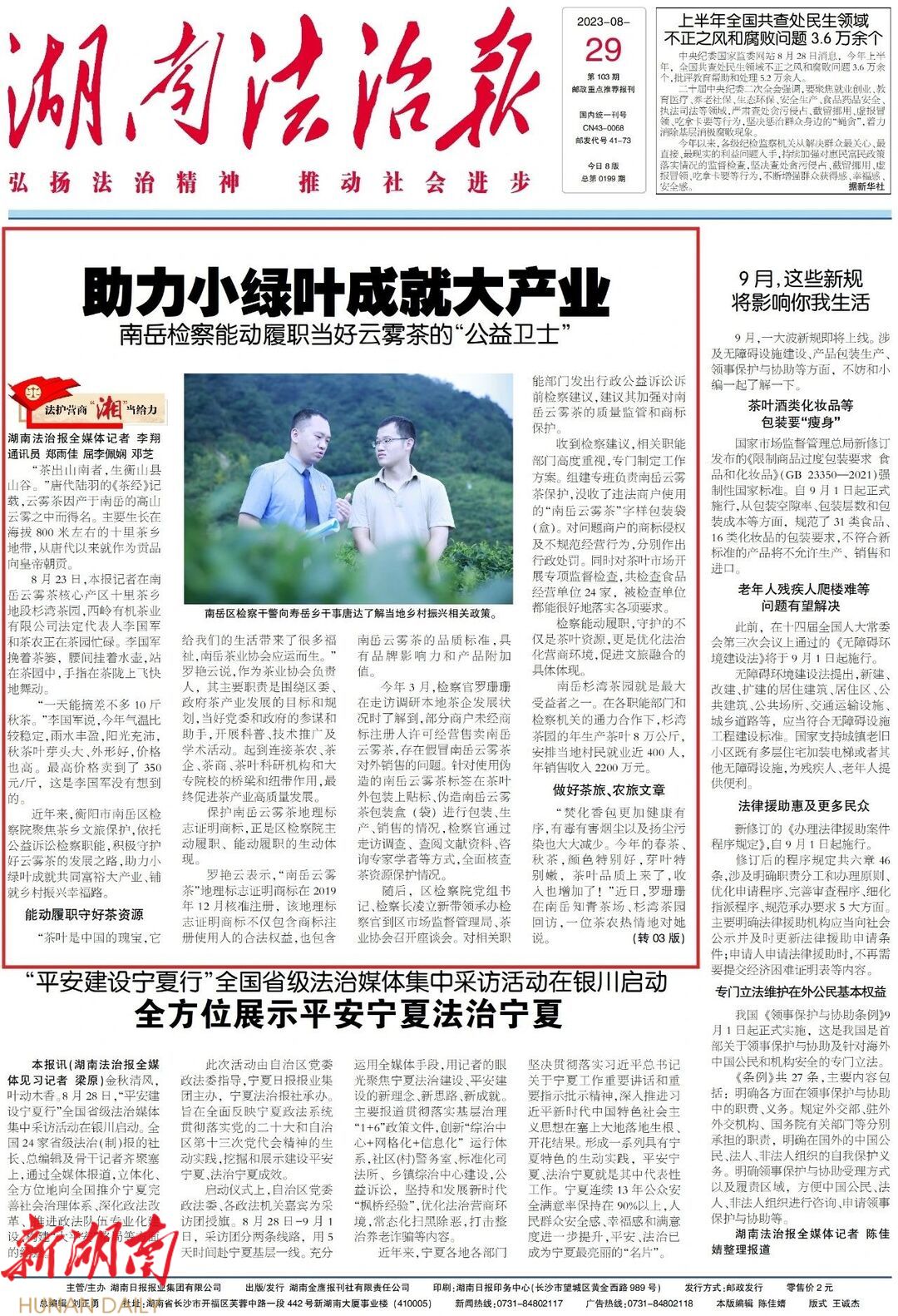 一片小绿叶,片片生黄金。8月22日,衡阳市南岳区检察院以湖南省检察院组织开展的“初心与梦想·走进基层检察院”系列活动之南岳检察“高质效履职护航山乡茶旅融合产业振兴”专题采访报道活动为契机,发布了《服务“南岳云雾茶”产业发展促进茶旅融合乡村振兴十条措施》,既检验了检察办案成效又深化了诉源治理效果,还推介了南岳云雾茶品牌。