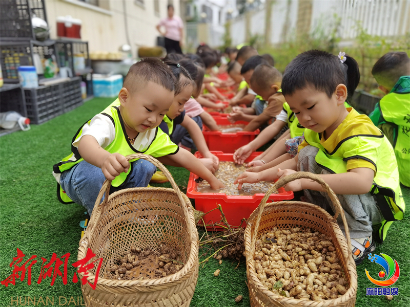 开学第一天,麻阳龙升幼儿园“开学第一课”——《劳动最光荣》别具风味,大班的数十名小朋友通过扯花生、洗花生、尝花生,体验收获喜悦,感受农耕劳动乐趣。