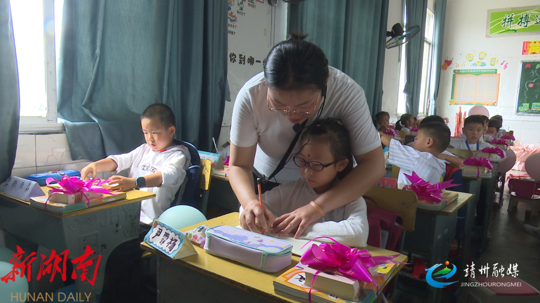 靖州融媒9月6日讯 (记者 钟屿右 通讯员:周燕)“一撇代表品格,一捺代表学识,希望同学们首先学会做人。”9月5日,在靖州苗族侗族自治县乐群小学一年级11班的思政课堂上,教师正在教学生书写“人”字,领会一撇一捺中蕴含的深意。