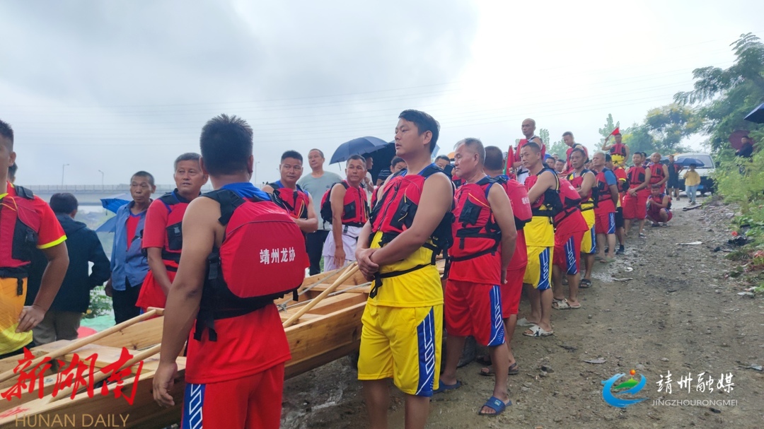 仪式现场,锣鼓喧嚣好不热闹,靖州县龙舟协会成员、龙舟选手及 沅陵县2023年冠军队队员一起见证新龙舟下水。