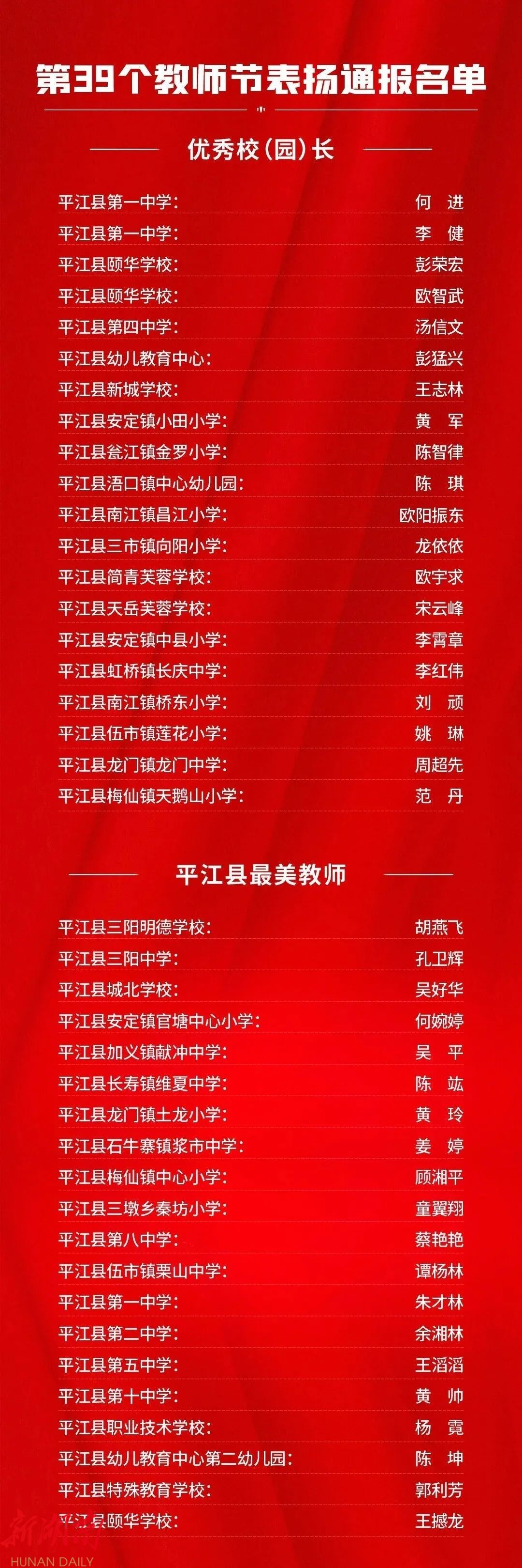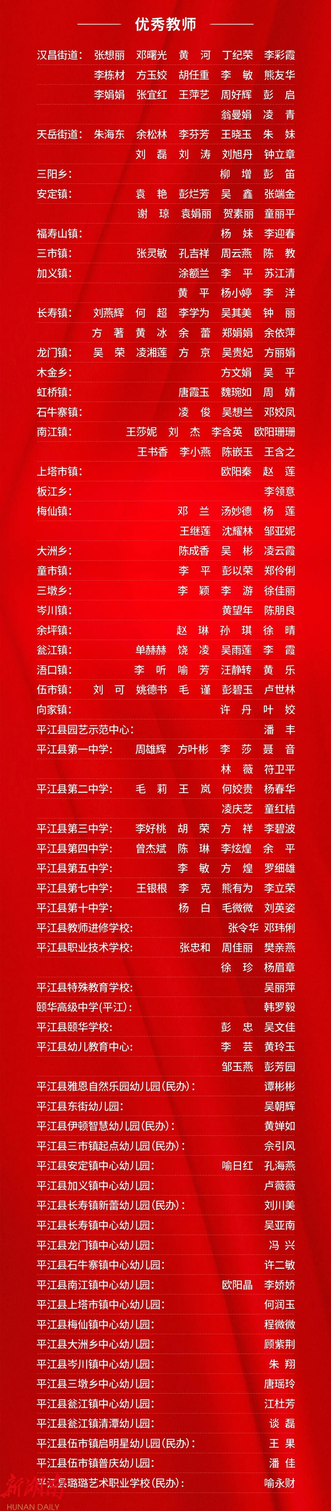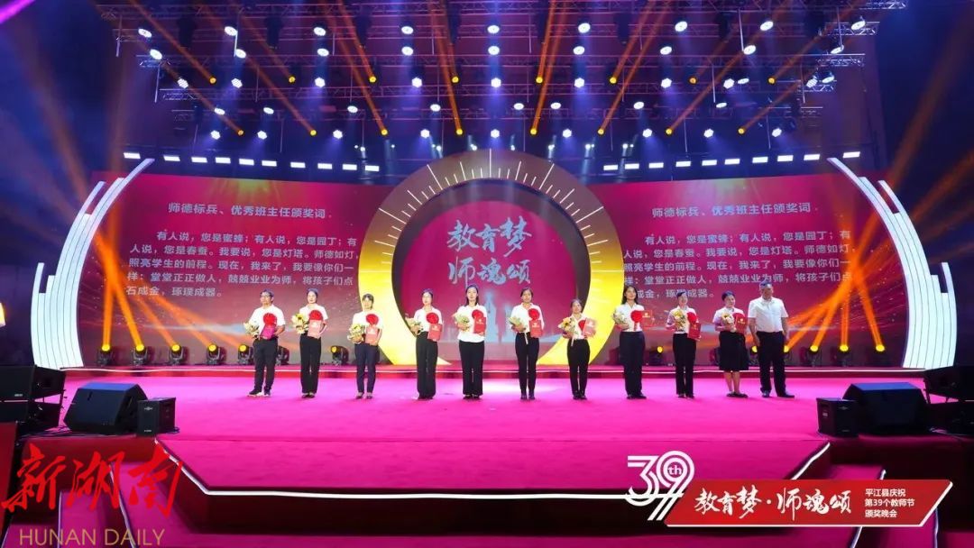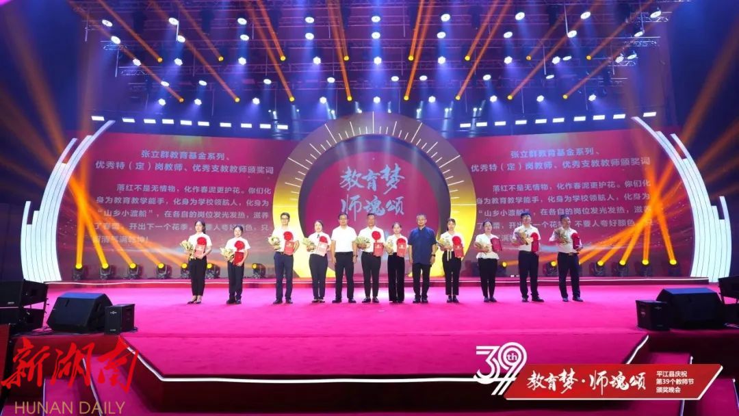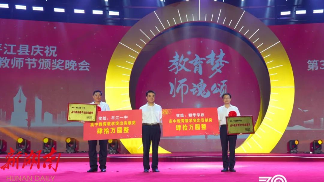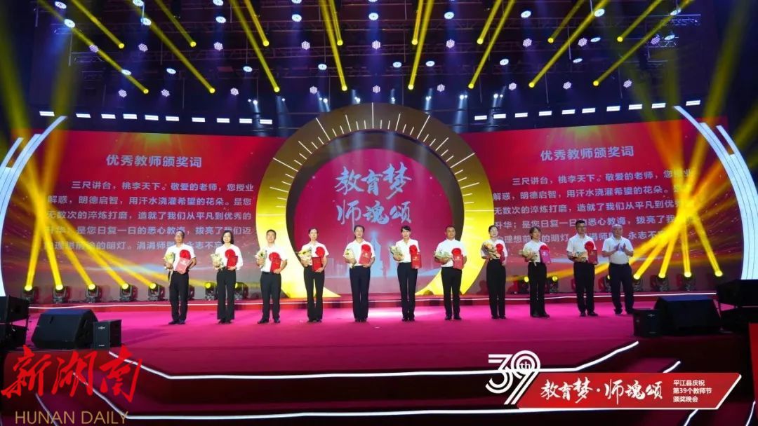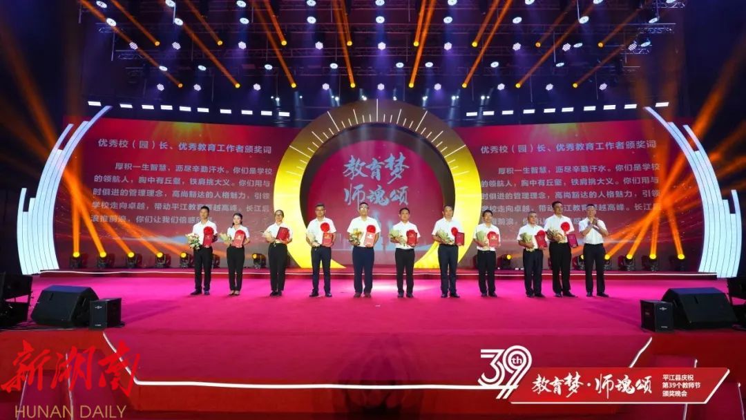 晚会上,平江一中和平江颐华学校获2023年高中教育教学突出贡献奖;会议表彰了20位“优秀校(园)长”、20位“平江县最美教师”、40位“师德标兵”、20位“优秀特(定)岗教师”186位“优秀教师”、80位“优秀班主任”、22位“优秀教育工作者”、6位“优秀支教教师”,以及26位2023年张立群奖教基金系列奖项获奖教师(校长)。