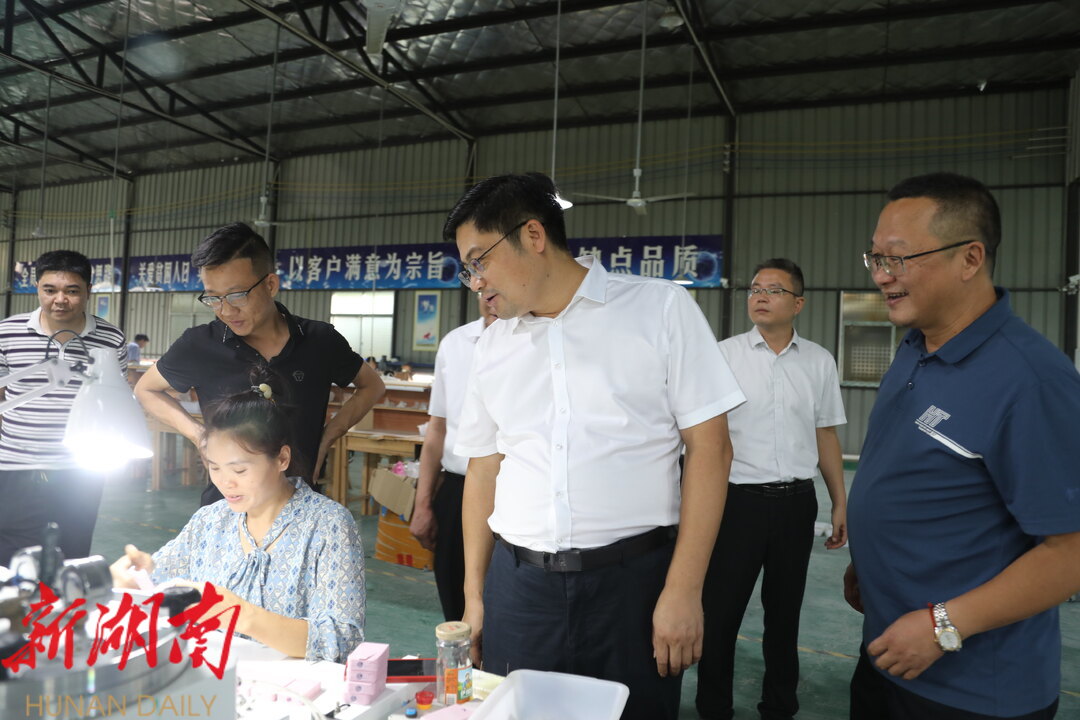 图为县委书记余勋伟在美鑫饰品公司调研企业运营情况