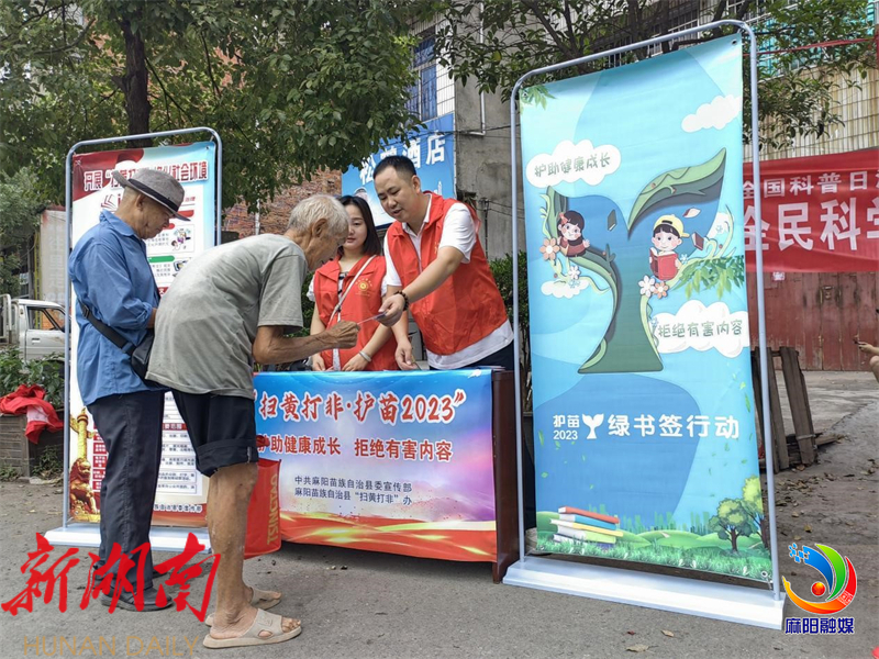 为进一步加大“扫黄打非”工作宣传力度,提高群众对“扫黄打非”的知晓率,9月20日,麻阳县委宣传部、“扫黄打非”办、新时代文明实践中心办公室牵头,组织兰里镇新时代文明实践所、“扫黄打非”办开展以“护助健康成长 拒绝有害内容”为主题的“扫黄打非•护苗2023”宣传活动。