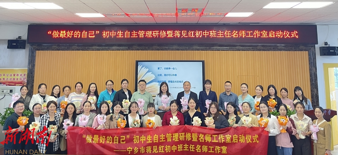 湖南日报·新湖南客户端讯 9月22日,“做最好的自己”初中生自主管理研修暨蒋见红初中班主任名师工作室启动仪式在梅花中学举行。宁乡市教育局普教科副科长岳瑞华、宁乡市教育研究中心主任贺海浪、宁乡市进修学校专家刘令军、长沙市优秀教育名师周玉龙、梅花中学校长戴喜强、初中班主任名师工作室首席蒋见红、工作室全体成员和梅花中学全体班主任参加。活动由工作室成员陈明星主持。