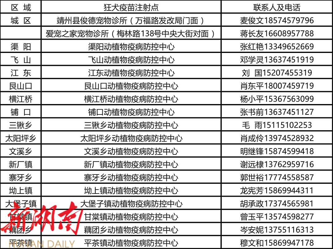 靖州县城区及各乡镇动物狂犬病疫苗注射点: