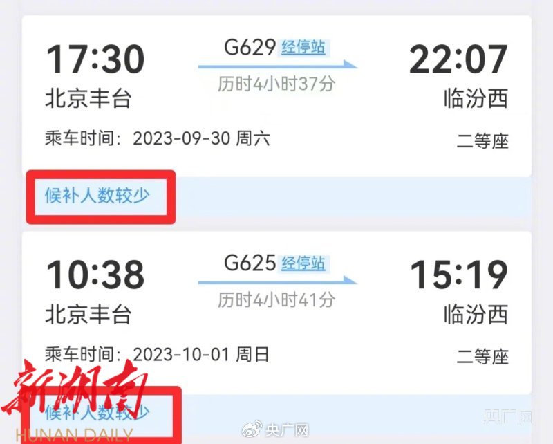 今年国庆假期,陈宇(化名)为了抢到从北京到山西老家的车票,她连续提交了两天的候补订单。陈宇表示,提交完订单后,她发现候补订单页面显示9月30日和10月1日所选择车次的“候补人数较少”。“候补人数少,是不是意味着候补的成功率更大?”