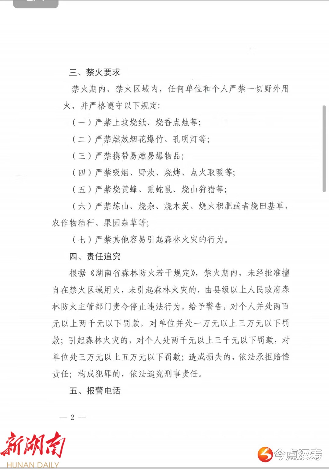 四、责任追究:根据《湖南省森林防火若干规定》,禁火期内,未经批准擅自在禁火区域用火,未引起森林火灾的,由县级以上人民政府森林防火主管部门责令停止违法行为,给予警告,对个人并处两百元以上两千元以下罚款,对单位并处一万元以上三万元以下罚款;引起森林火灾的,对个人处两千元以上三千元以下罚款,对单位处三万元以上五万元以下罚款;造成损失的,依法承担赔偿责任;构成犯罪的,依法追究刑事责任。