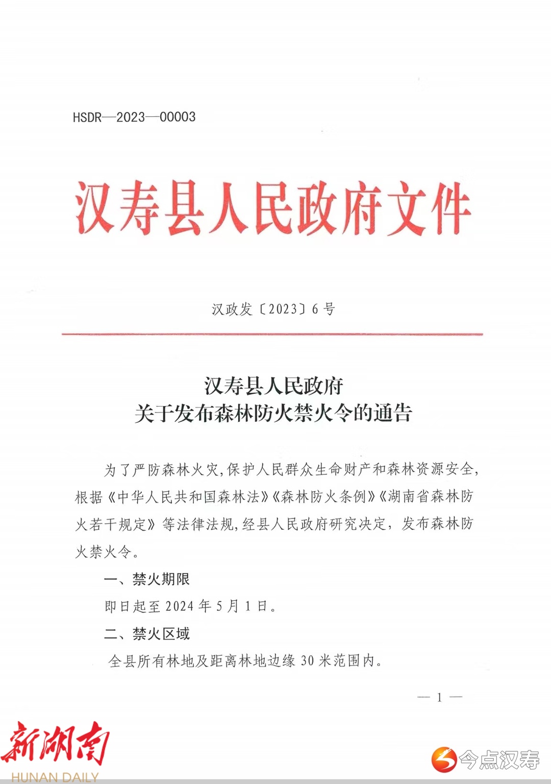 为了严防森林火灾,保护人民群众生命财产和森林资源安全,根据《中华人民共和国森林法》《森林防火条例》《湖南省森林防火若干规定》等法律法规,经县人民政府研究决定,发布森林防火禁火令。