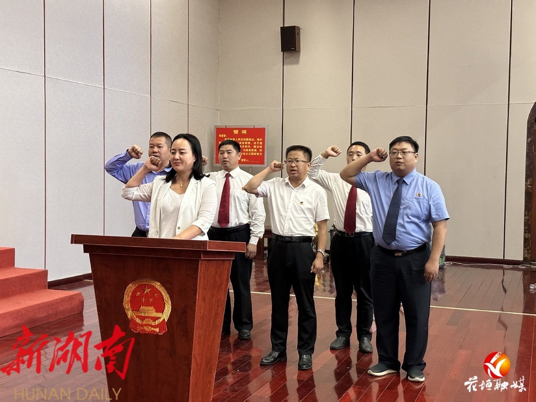 龙仕英向新任职人员颁发任命书,新任职人员向宪法进行宣誓。