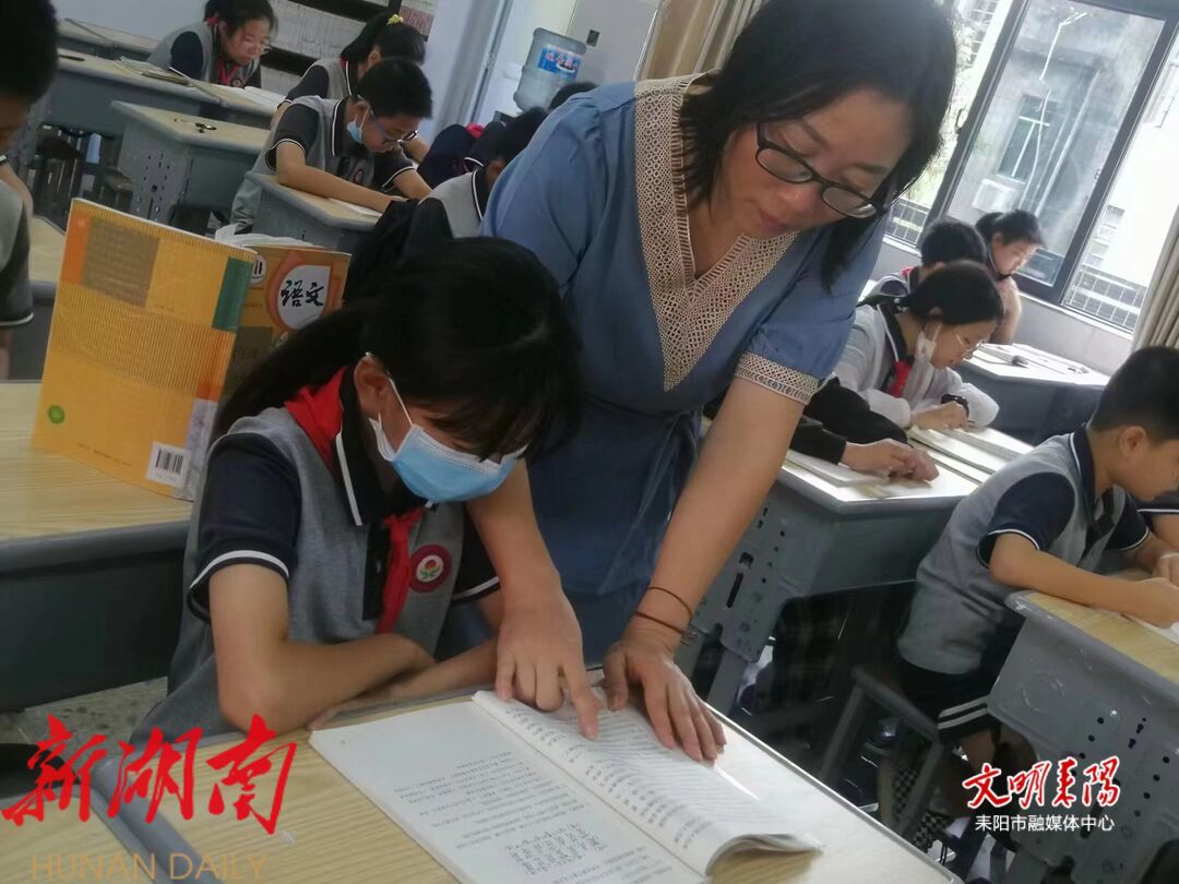 语文课堂中洋溢着她的热情与坚守,深夜灯光下有着她对教学的执着和追求。教室里师生低吟诵读,书桌旁她细致斟酌批改。