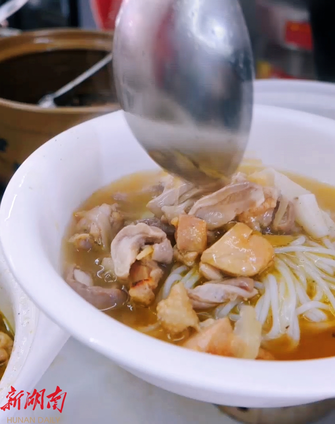 记者品尝杀猪粉,粉面软糯,汤底浓郁,用料十足