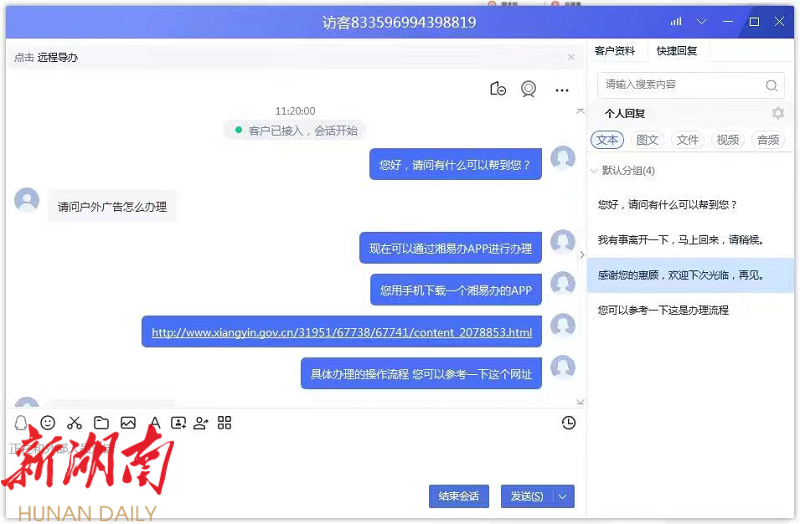 湖南日报·新湖南客户端10月11日讯(通讯员 杨卓)近日,湘阴县市民徐先生在家首次尝试“远程导办”服务,不到5分钟就完成了户外门头招牌广告的网上申报和预审。徐先生表示:“现在办事通过‘远程导办’就可以享受一对一线上服务,真是太方便了!”