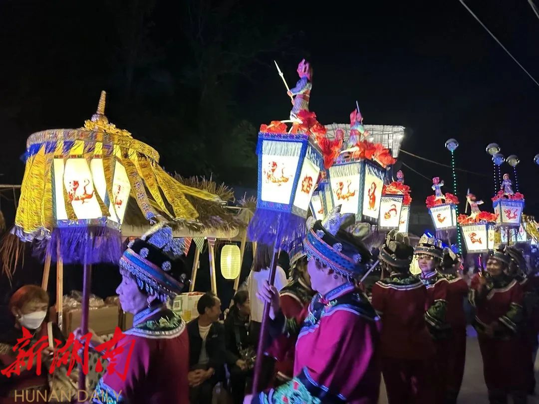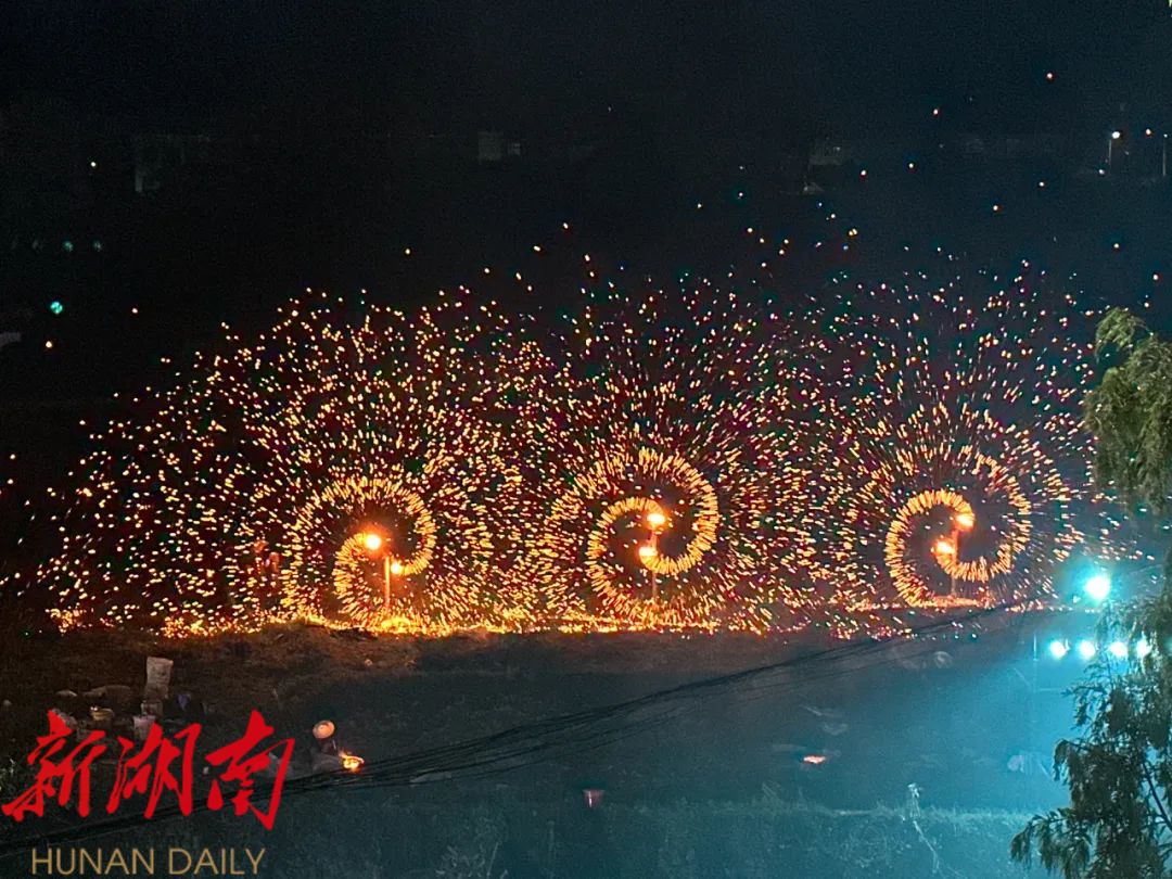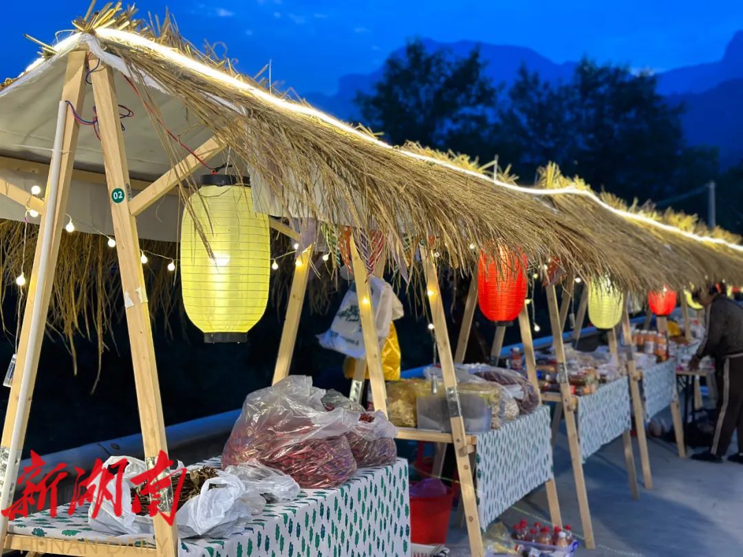 集市因水而建,靠河而栖。走进集市,天门山镇全镇晒秋,色彩斑斓。夜幕降临,二十四节气灯笼墙、百福灯笼墙、兔子造型灯等各类灯饰点亮了整个街区;国风巡游,河灯沿河放流祈福,土家非遗高花灯队伍沿街巡演舞动银河;国家级非遗打铁花惊艳绽放,浪漫又壮观,还有水上舞台,民谣乐队倾情演绎,引得观众激情欢呼,欢声笑语与绝美夜景如同一幅流光溢彩的画卷。