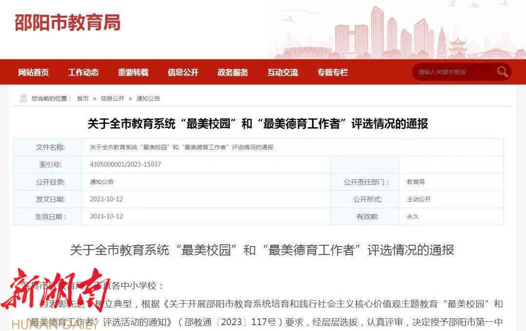 邵阳市教育系统“最美校园”评选活动是依据《关于开展邵阳市教育系统培育和践行社会主义核心价值观主题教育“最美校园”和“最美德育工作者”评选活动的通知》(邵教通(2023)117号)要求,从各县市区和各学校中,评选出一批具有文化主题鲜明、校园建设完善、环境卫生美洁、校园绿化优美、校园活动丰富有亮点、师生素养良好的学校给予表彰,树立典型。