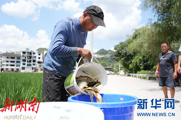 台江村民在排羊乡“稻+鱼”示范基地抓稻花鱼送往市场。(邰春 摄)