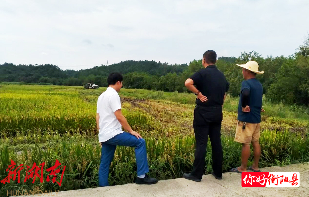 图:岣嵝乡党委书记蒋霁与种粮大户邹玉龙一起查看晚稻情况