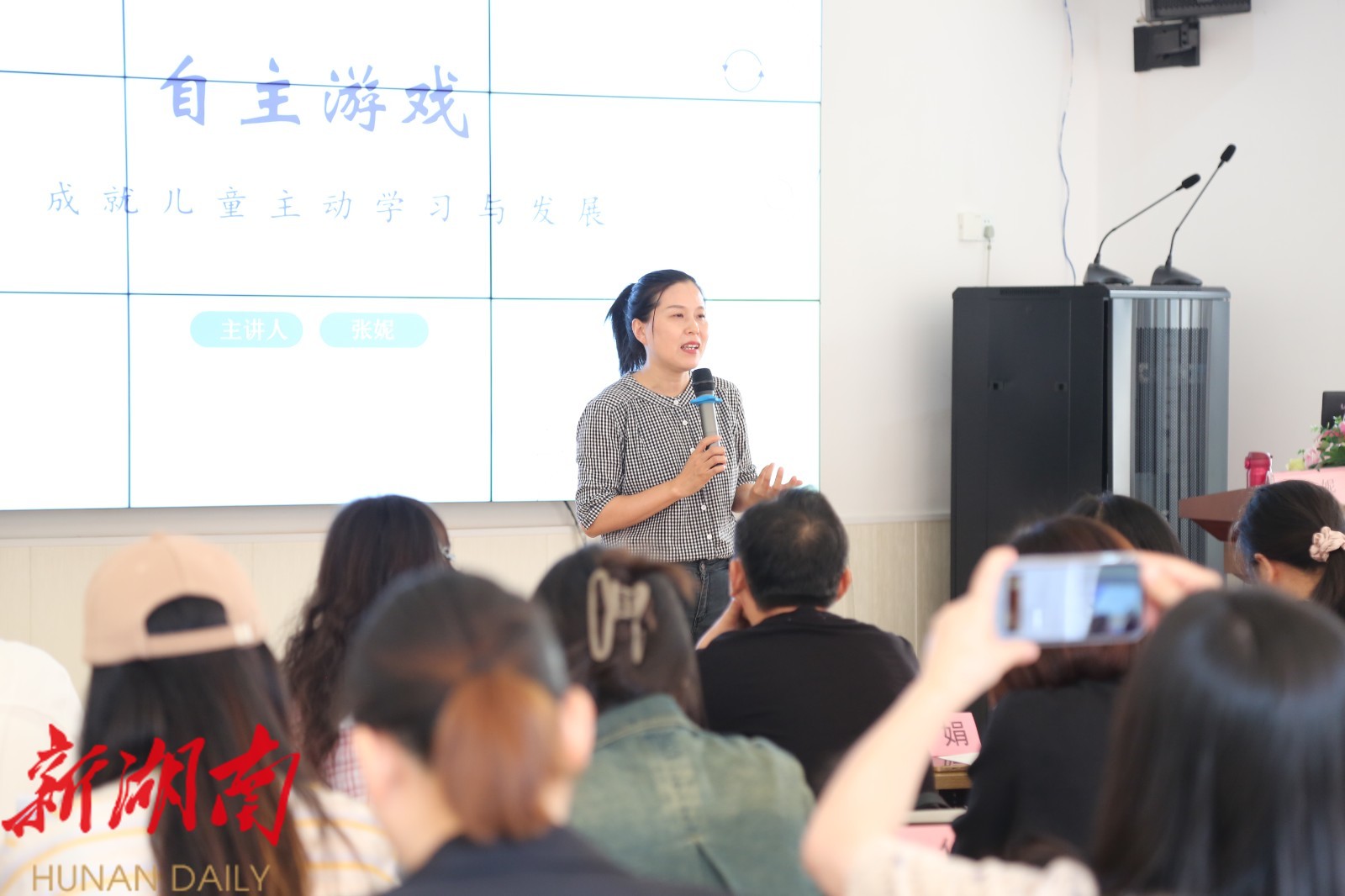 在专题讲座环节,武陵区学前教育教研员张妮组织开展了《自主游戏——成就儿童主动学习与发展》专题讲座,结合案例,分析自主游戏中蕴含的幼儿学习与发展,并与教研团队成员共同探讨如何从游戏时间、游戏场地、游戏材料和游戏中教师的支持与回应等方面推进自主游戏的组织与实施。