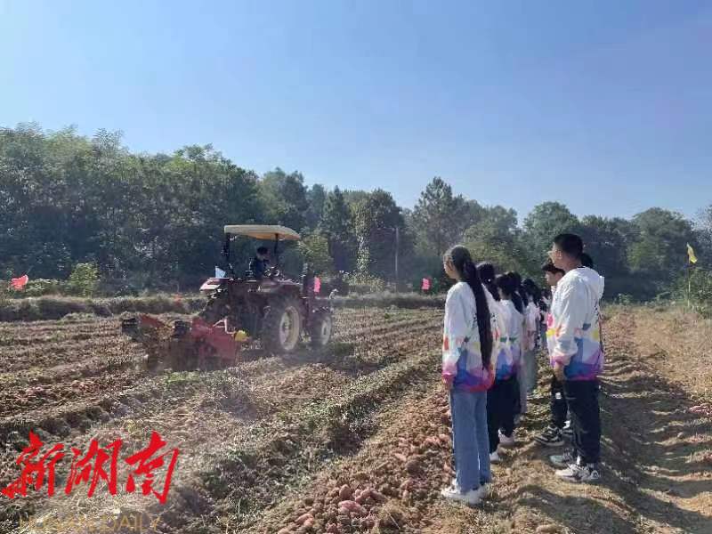 秋天是收获的季节,此时正是红薯成熟之际。当天,在老师的带领下,学生们来到湖南杨阿嫂农业科技发展有限公司的红薯基地,并在湖南省农科院红薯专家、研究员张超凡等人的指导下,现场了解红薯的生长习性和环境要求,参观机械收获红薯。通过现场教学,学生们了解到使用红薯收获机不仅能大大提高工作效率,还能最大限度的减少损耗。同时,这些机械的引入,对工人的知识与技术水平,也是个很大的挑战,如果没有经过系统的学习和专业培训,很难驾驭得了这些高大的“家伙”。学生们纷纷表示,将通过努力学习,将来更好地服务现代农业。