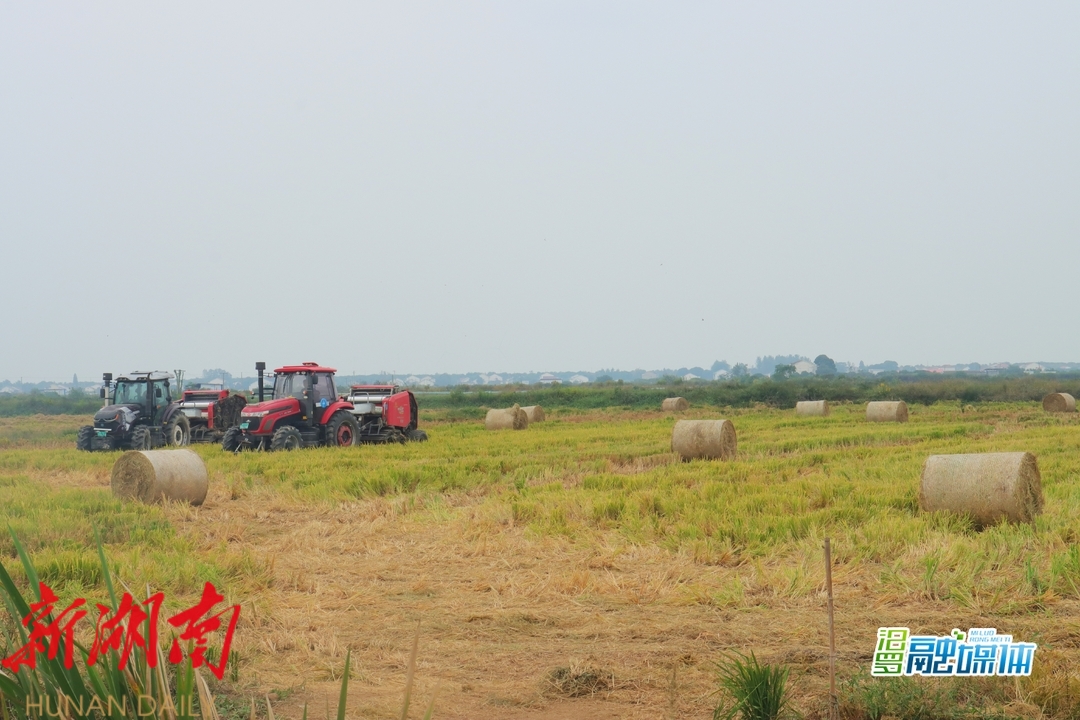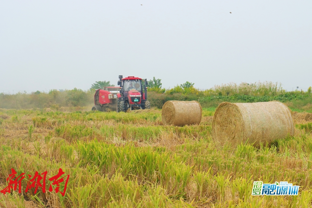 草屑纷飞,机械轰鸣。在位于磊石垸的汨罗市业兴农业专业合作社稻虾田内,一台台搂草机挥舞着巨大的转盘,迅速将收割完后的水稻秸秆整齐地搂成一行,数台深红色"巨无霸"打包机紧随其后,把田间成行的秸秆快速卷入"腹中",数分钟后便吐出500斤重的"圆柱体"成型秸秆一捆,打包后的成型的秸秆梗,回收后将成为牛羊饲养的重要草料来源。