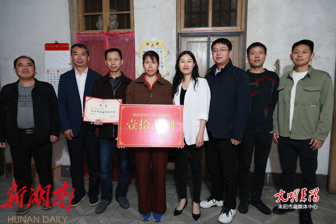 10月20日上午,副市长阳姣丽,市政协副主席、文旅广体局局长陆小勇来到亚运冠军邓丽娟家中看望慰问,并送去10万元奖金,同时邓丽娟还受邀成为耒阳市旅游形象大使,为家乡旅游代言!