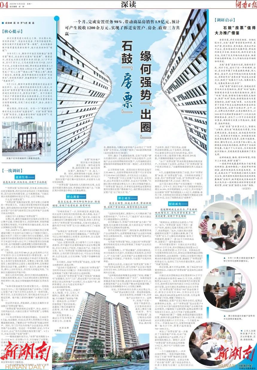 今年9月1日,衡阳市石鼓区创新推出“房票安置”模式,求出拆迁安置的“最优解”。数据显示,该区此次拆迁安置任务共320套、3.7万平方米,至9月30日止,已完成安置任务314套、3.6万平方米,占安置任务的98%,带动商品房销售共1.9亿元,预计可产生税收1200余万元,把“第一难题”变成了“民心工程”“德政工程”“精品工程”,铸就了高站位、高质量、高效率推进拆迁安置的“石鼓样本”,受到热烈拥护、普遍赞扬和广泛关注,成为“现象级IP”。