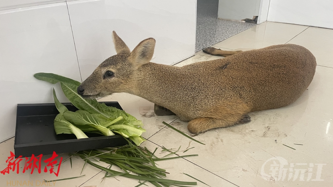 在沅江市万子湖派出所内,工作人员贴心地为这只动物准备了青菜等食物,但该动物明显受到了惊吓,毛茸茸的耳朵不停地颤动,惊恐地瞪着两只黑黑的、圆圆的眼睛,蜷缩在角落里一动不动。工作人员本想将其放生,但不确认它是否能正常生存,便将此事通知了沅江市林业局,随后通过林业局,与长沙市飞鸟乐园野生动物救助站取得了联系,并将照片发往救助站进行鉴定,最终确定倪勇救助的这只野生动物是河麂。