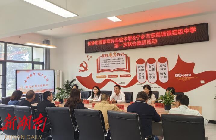 湖南日报·新湖南客户端讯(通讯员 付兰 殷丹)10月25日,长沙市湘郡培粹实验中学与宁乡市东湖塘初级中学教学共同体签约仪式暨第一次联合教研活动在东湖塘初级中学会议室举行。长沙市湘郡培粹实验中学校长王星携各学科教研组长,东湖塘镇中心学校党总支书记、校长殷丹及班子成员出席签约仪式。