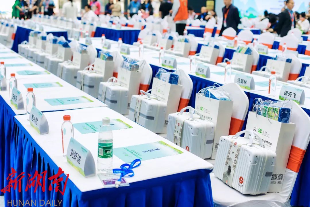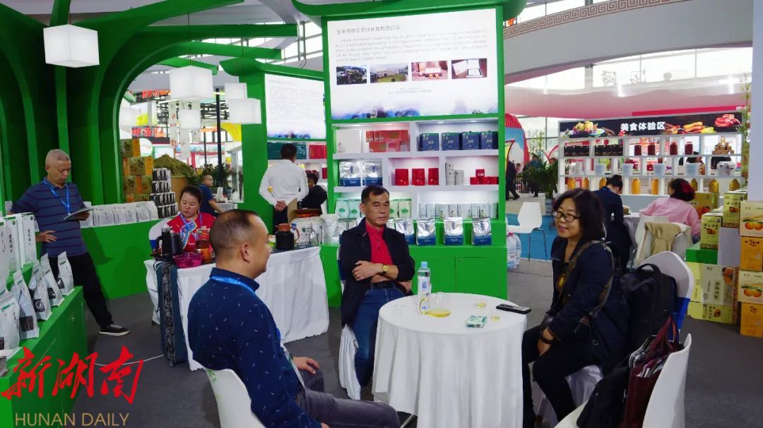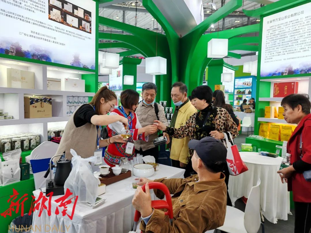 在农博会桑植展区,湖南张家界九天生物科技有限责任公司、张家界金鲵生物工程股份有限公司、湖南湘丰桑植白茶有限公司、张家界西莲茶业有限责任公司、张家界林丰茶叶有限公司、张家界爱尚园茶业有限公司等15家企业集中展示展销桑植白茶、葛根、大鲵、腊肉、蜂蜜、莓茶、青钱柳、绞股蓝、油茶等特色优质农产品,展柜前,前来品鉴、购买产品的人络绎不绝。
