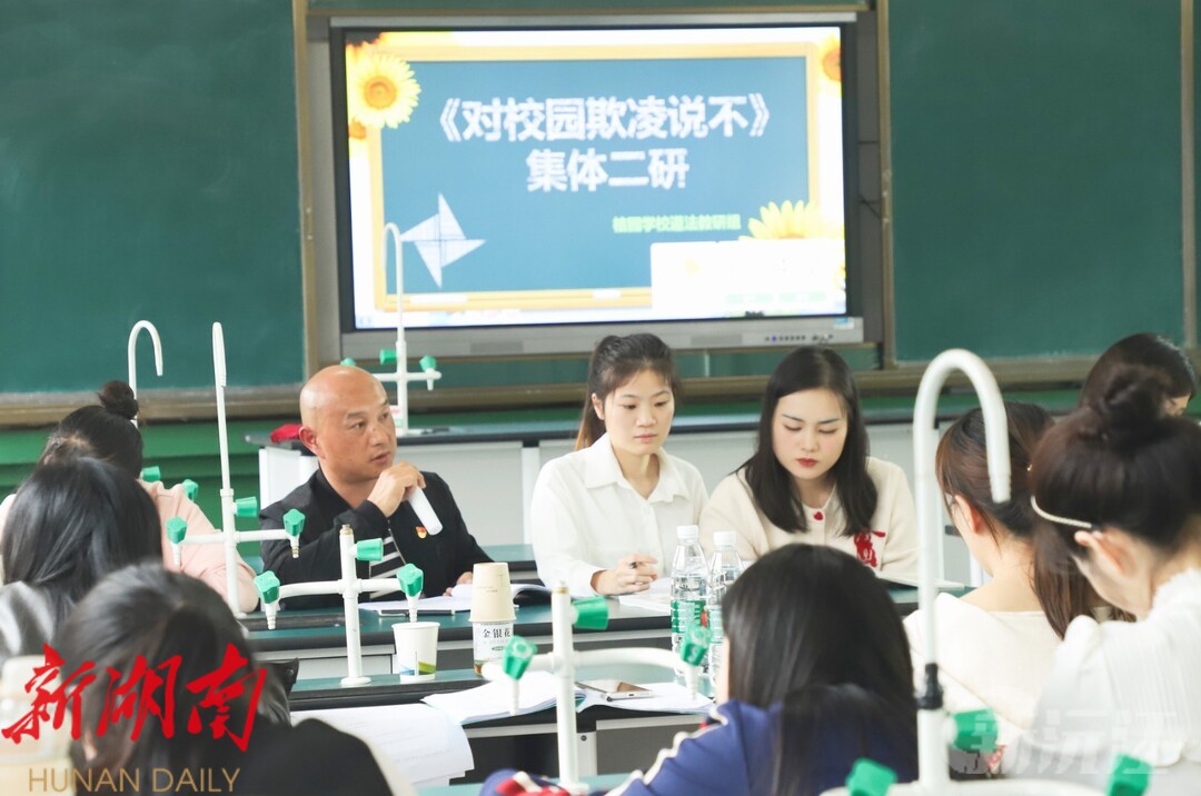 活动伊始,桔园学校、南洞庭实验学校和政通小学的老师分别进行了《对校园欺凌说不》《依法维权有途径》《我是中国公民》的课例展示。同时,桔园学校思政组依托本校课例《对校园欺凌说不》,展示了“集体二研”环节,并用视频形式呈现了整个“三备两研”流程。