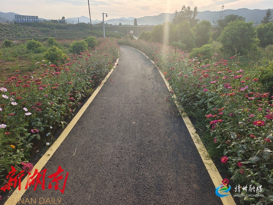 在靖州苗族侗族自治县贯堡渡中药材产业示范基地,只见道路两旁开满了波斯菊,姹紫嫣红(舒昭兵 摄)