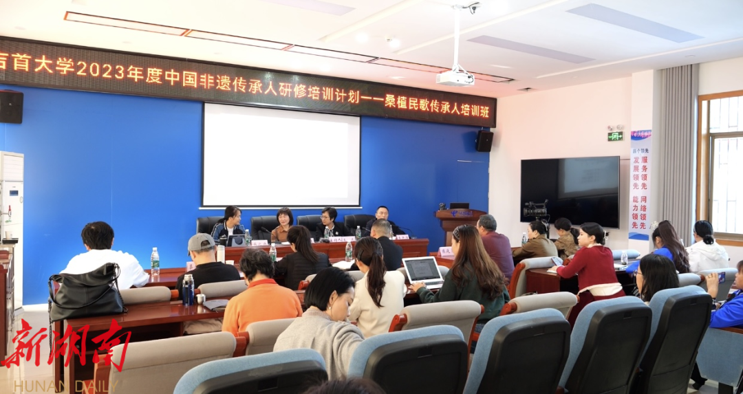 湖南日报·新湖南客户端 11月1日讯(记者 肖君)11月1日,吉首大学2023年度中国非遗传承人研修培训计划——桑植民歌传承人培训班在桑植开班。县委常委、宣传部部长王茂蓉担任讲师,为50余名培训学员展开了一场生动有趣的培训讲座。