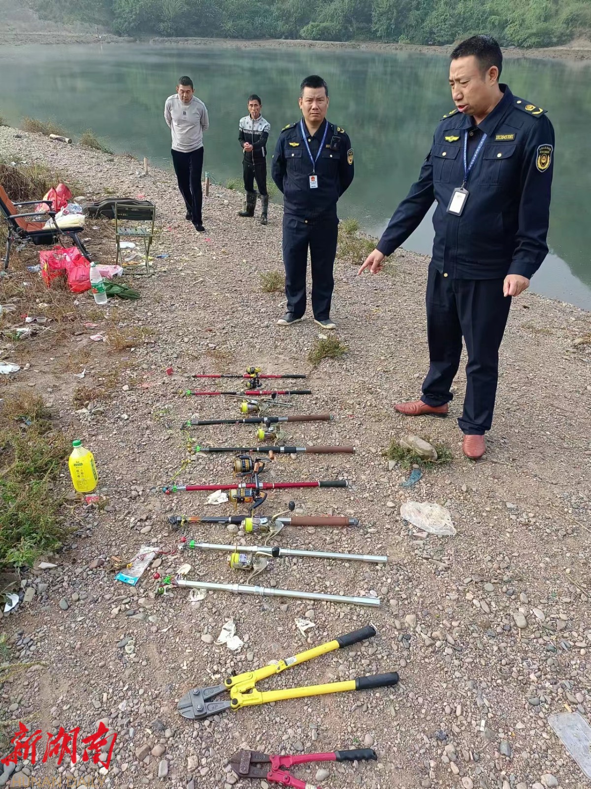 此次行动重点对辖区内舞水河芭蕉村毛家河段开展执法检查,突击查处河段沿线违法垂钓行为。每到一处,执法人员都会认真检查垂钓人员的鱼竿、鱼钩、饵料,现场宣传相关法律法规和“禁渔退捕”相关政策,鼓励群众积极举报各种违法行为和非法捕捞线索。针对检查发现的非法垂钓行为,现场对垂钓人员进行了批评教育。