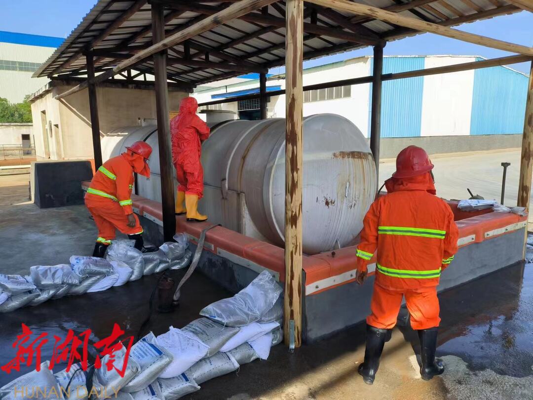 本次演练以湖南谊诚科技有限公司硫酸储罐区管道破损致使大量硫酸泄露为背景,“事故”发生后企业立即向上汇报,通知各应急小组赶赴现场,使用沙袋构筑围堰、堵漏胶对泄露点进行围堵,并将泄露硫酸抽至事故应急罐,有效防止污染扩散。
