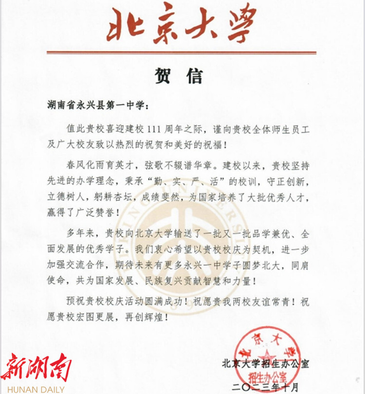 湖南日报·新湖南客户端11月6日讯(记者 朱熙)在永兴县第一中学111周年校庆来临之际,北京大学发来贺信,表达对永兴一中111周年校庆的祝贺和对未来发展的美好祝愿。