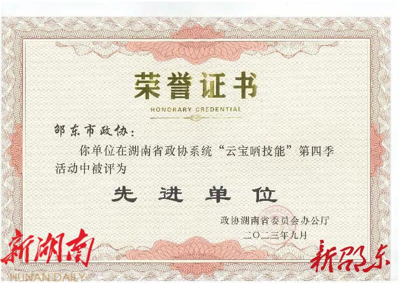 新邵东客户端11月7日讯(通讯员 刘昭云) 近日,从湖南省政协“云宝晒技能”第四季活动获奖通报中获悉,邵东市政协获评先进单位,宁红艳、李剑雄、杨小祥等10名政协委员获评“优秀委员”,市政协“政协云”信息服务中心主任吴新建获评“优秀工作者”。