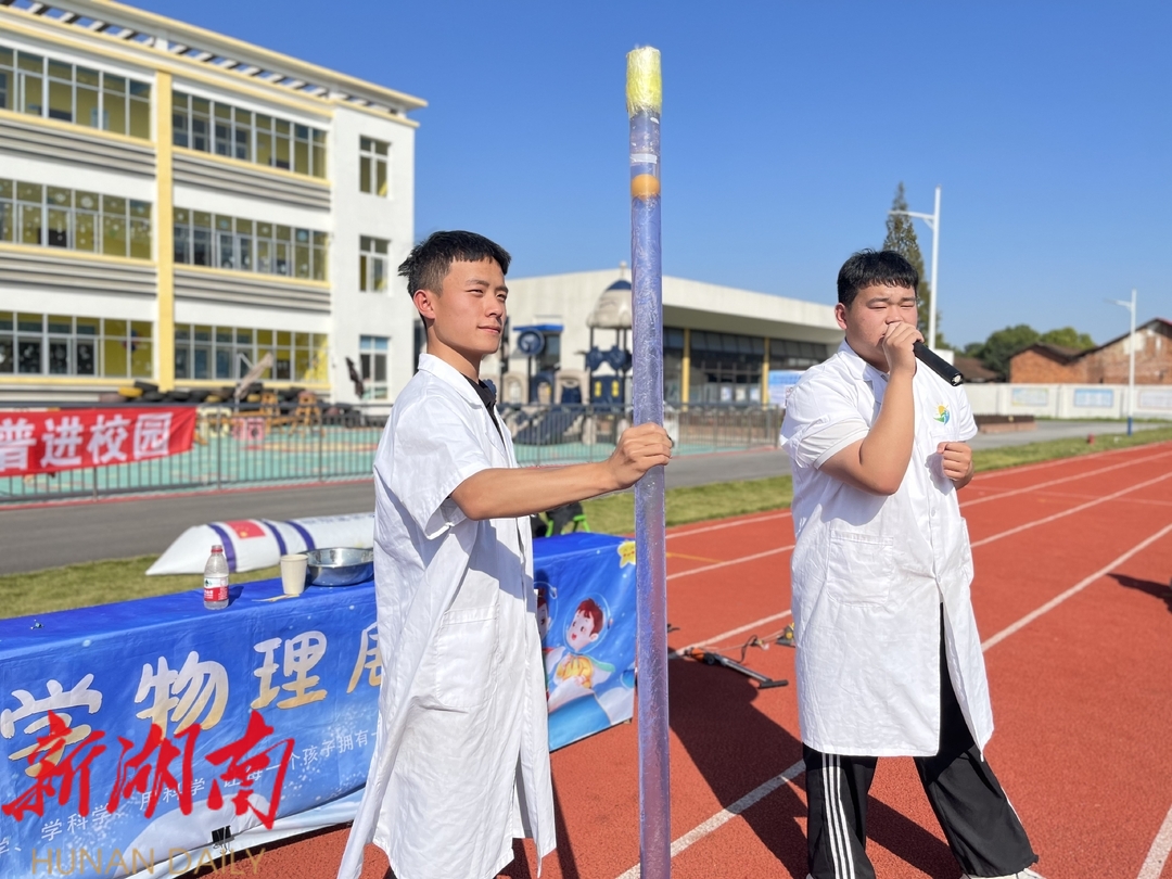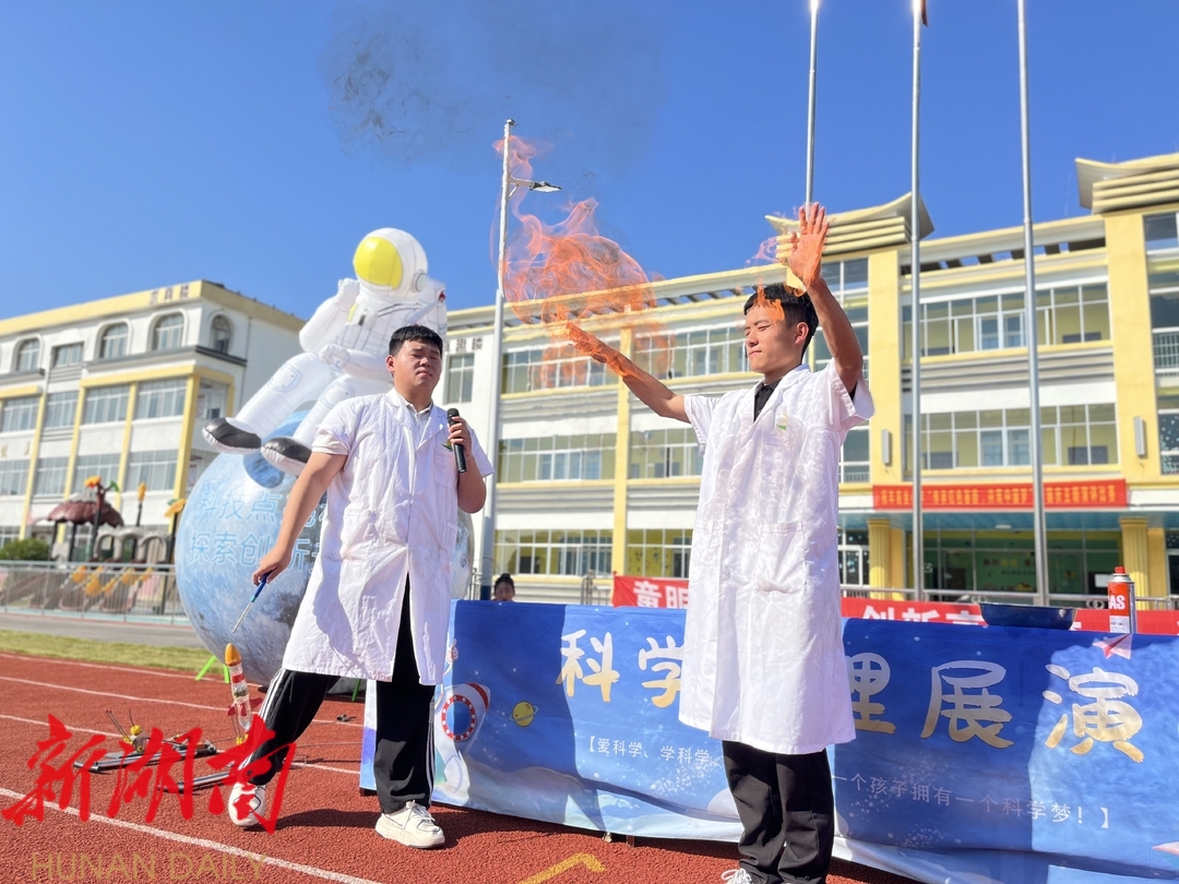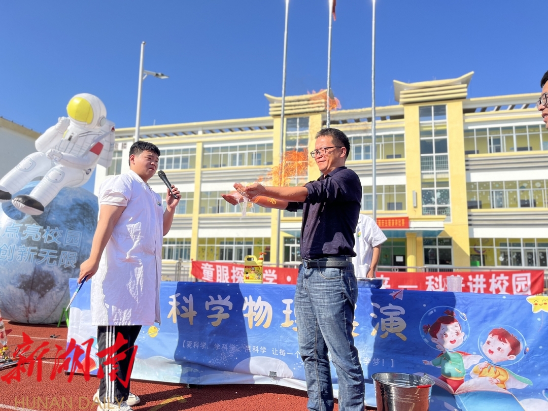 “同学们,你们遇到过困难吗?当遇到困难时你会怎么做呢?是打败困难还是屈服于困难?”老师说道。接着,他带领学生做了一个神奇的水火箭实验。在火箭的底部加上“困难水”,同学们卯足了劲儿为水火箭加压,“咻!”只见水火箭的尾部瞬间进射出大量白色水花,与之同时水火箭腾空而起。我们的“火箭”在跨越了一整个操场后才迟迟落下。本次表演还呈现了混合丁烷与洗洁精能让火焰在手掌上燃烧;物理经典的马德堡半球实验;利用大气压和伯努利原理的逆流而上实验……一个个精彩的演示,引来学生们阵阵欢呼、惊讶声不断,现场气氛热烈。