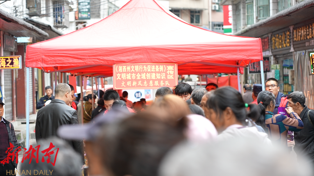 新湖南客户端11月8日讯(通讯员 鲁岗)11月8日清晨,在古阳镇农贸大市场,湘西土家族苗族自治州古丈县新时代文明实践中心统筹协调开展“文明城市同心同创美丽古丈共建共享”志愿服务活动,让活动精神深入基层走近群众。农贸市场上摊主们纷纷摆出自己的货物,各种各样的摊位和行人摩肩接踵,构成了生机勃勃的画面。