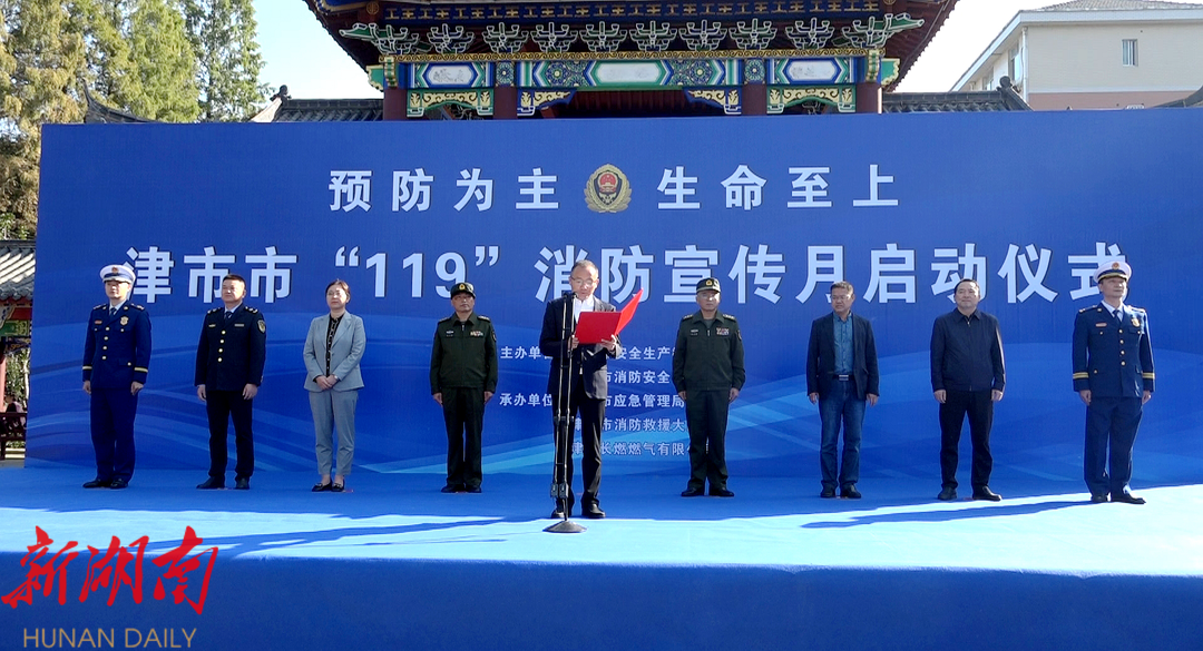启动仪式由市人民政府副市长曾令军主持。仪式上,市消防救援大队负责人宣读了津市“预防为主、生命至上”119消防宣传月方案;市人民政府副市长陈璐通报了长期积极支持与配合消防工作的先进单位和优秀个人,并现场进行颁奖;市委常委、常务副市长邱献兵宣布“119”消防宣传月活动正式启动。