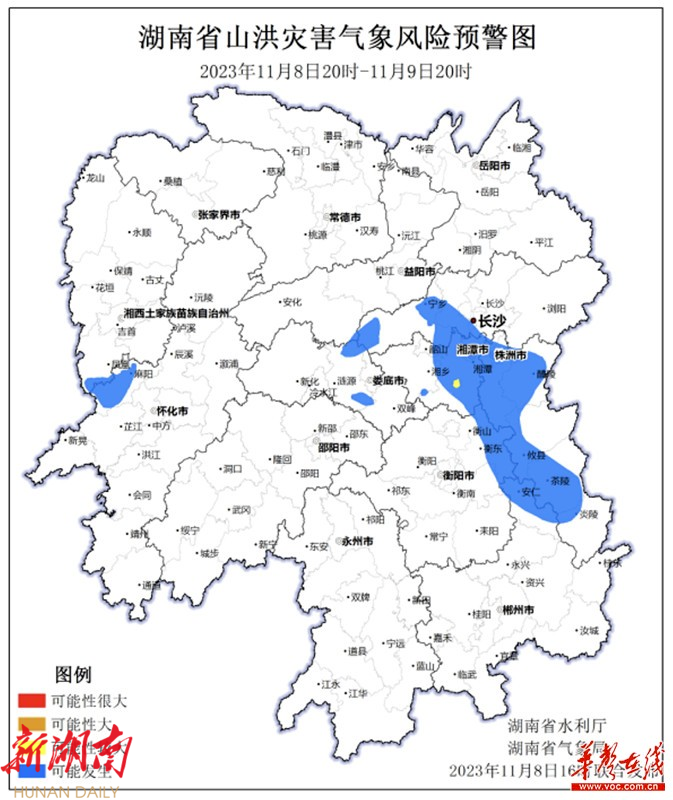 根据湖南省气象台2023年11月8日短期气象预报情况,省水利厅与省气象局联合会商得出如下结论:自11月8日20:00至9日20:00,受降雨影响, 长沙市、株洲市、湘潭市、衡阳市、益阳市、郴州市、娄底市、怀化市、湘西州局地可能发生山洪灾害(蓝色预警),其中湘潭市中部局地发生山洪灾害的可能性较大(黄色预警)。