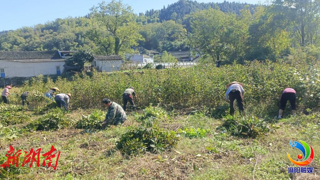 正值秋收好时节,大桥江乡豪侠坪村的乡村干部、村民们头戴斗笠、手拿镰刀躬身在足有成人高的广东紫珠中药材种植地内来回穿梭收割,随后打捆、搬运、称重、装车,他们脸颊通红、汗水滴落,却藏不住丰收的喜悦。