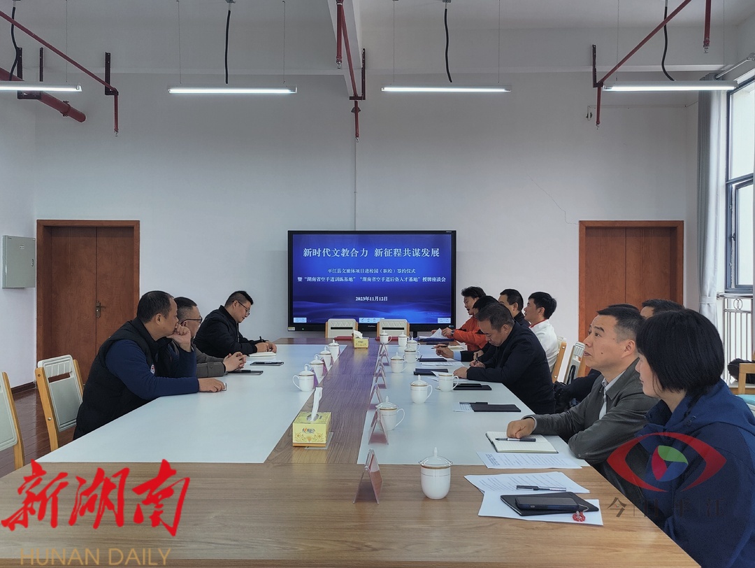 与会嘉宾参观了学校空手道训练基地,观看了平江县空手道队员们的表演。现场召开了座谈会,并就平江县空手道项目发展和平江县文旅体项目进校园工作进行交流座谈,举行了文旅体项目进校园(职校)签约仪式。随后,领导嘉宾共同为《湖南省空手道训练基地》《湖南省空手道后备人才基地》揭牌。