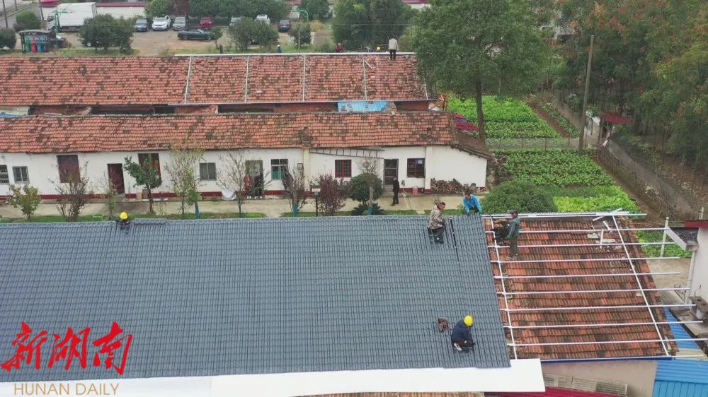 据现场工人介绍,这次改造不是换瓦,而是直接在原来的屋顶上铺设一层新瓦片,对屋顶进行翻修,架设钢梁,做脊,封檐,然后再铺上便宜又实用的树脂瓦,既节省了工程量,也不会对房屋主体结构造成损伤,而且树脂瓦比琉璃瓦或者砖瓦都更加耐用、美观,确实是一个经济、高效、美观的改造方案。