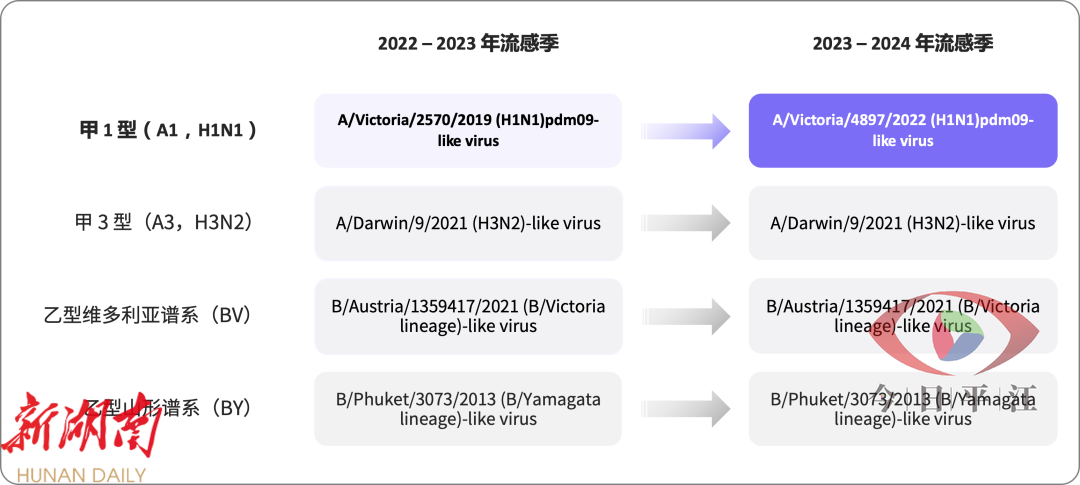 由于流感病毒容易变异,每年流行的毒株都可能与往年不同,每年的疫苗成分也会有相应的调整,比如今年相比去年就有调整: